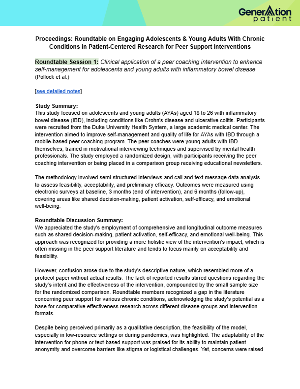 To cite this work/resource: Reed, S., Kelekian, R., Dave, S., Melton, K., Edwards, H., Jayswal, N., Hsu, C., Betz, C. 2025. Guidance Document for Patient-Centered Research on Peer Support for Young Adult Patients. Generation Patient. Online. Accessed [insert date accessed]. [https://generationpatient.org/peer-support-roundtable]